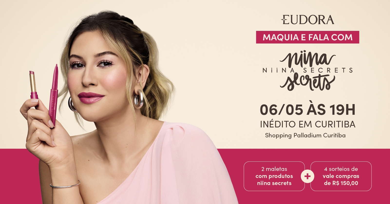 “Trazer o ‘Maquia e Fala’ para o presencial em tantos estados do Brasil, e agora em Curitiba é um sonho realizado! Nada se compara à troca que acontece ao vivo, olhando nos olhos de quem me acompanha há tantos anos e retribuir o carinho que eles me dão diariamente. É uma chance especial de ensinar, ouvir, rir e viver momentos únicos com quem faz parte da minha história e também da minha trajetória na linha Niina Secrets com Eudora”, afirma Niina Secrets.