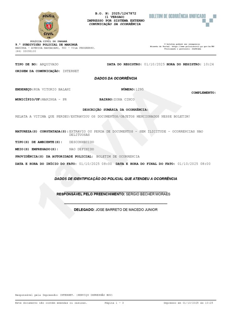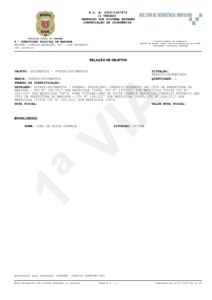 O extravio das referidas Certidões foi comunicado e registrado por meio de Boletim de Ocorrência (BO), que se encontra em anexo ao processo administrativo pertinente.