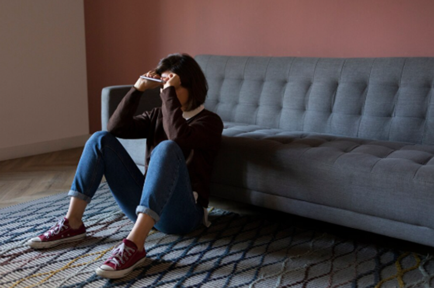 Mulher ansiosa de tiro completo sentada no chão | Foto Grátis