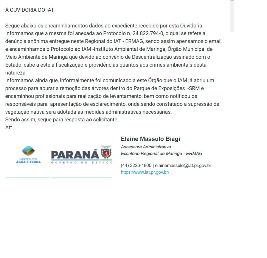 A assessora do IAT enfatizou que a etapa seguinte será rigorosa: caso o levantamento técnico comprove que houve a supressão de vegetação nativa sem a devida autorização legal, o IAM aplicará as “medidas administrativas necessárias”. A investigação, motivada tanto pelo alerta anônimo quanto pela imprensa, reforça a fiscalização ambiental na cidade. O comunicado, por fim, encerra o trâmite na esfera do IAT e segue para responder ao solicitante, garantindo a transparência do processo.