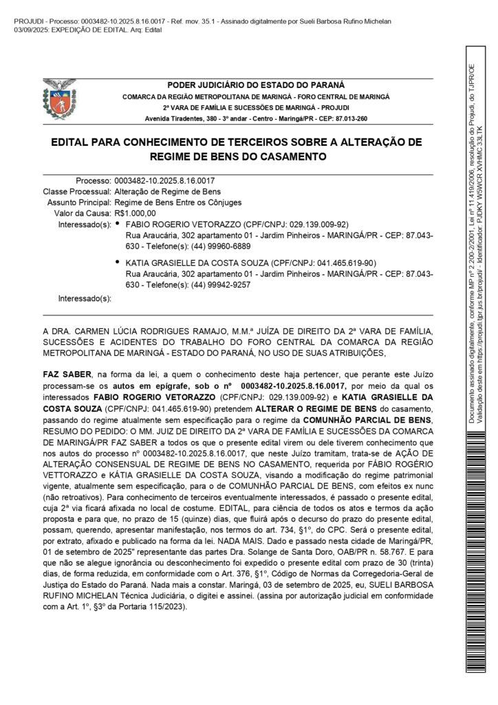 EDITAL ALTERAÇÃO DE REGIME DE BENS DO CASAMENTO 25/11/2025 Publicidade Legal/ Editais Verifique a autenticidade da publicação pelo QR Code. EditalMudança de Reginme de CasamentoO Diário de Maringápublicação legal