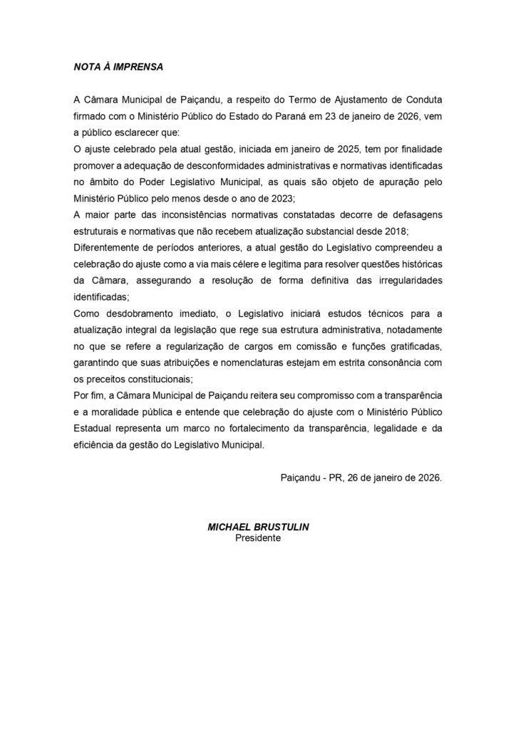 A nota da Câmara Municipal de Paiçandu sobre o Termo de Ajustamento de Conduta firmado com o Ministério Público do Paraná deixa, nas entrelinhas, uma constatação incômoda. As irregularidades não surgiram agora. Elas foram toleradas por gestões anteriores e só começaram a ser enfrentadas após a intervenção externa do Ministério Público.