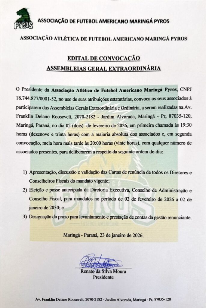 Edital de Convocação de Assembleia Geral Extraordinária 27/01/2026 Publicidade Legal/ Editais Para conferir a autenticidade da publicação, utilize o QR Code disponível. EditalEdital de Convocação de Assembleia Geral ExtraordináriaMaringa PyrosOI diário de Mairngápublicação legal