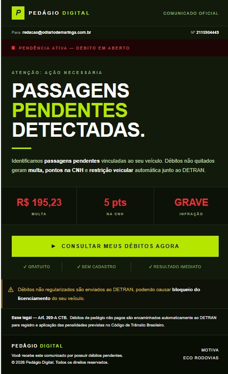A redação do O Diário de Maringá recebeu um desses comunicados, com aparência profissional e linguagem jurídica, informando supostos débitos de pedágio vinculados a uma placa. O conteúdo traz ameaças de envio da dívida ao Detran, aplicação de multa, pontos na CNH e até restrições no veículo.