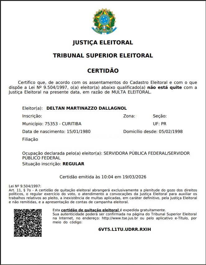 A candidatura de Deltan Dallagnol ao Senado atravessa um campo minado onde o discurso político colide frontalmente com a frieza dos documentos oficiais. Enquanto o ex-procurador da Lava Jato percorre o Paraná afirmando sua elegibilidade, um documento datado de 25 de março de 2026 impõe um freio retumbante em suas pretensões. A Certidão de Quitação Eleitoral, obtida com exclusividade, é clara: Deltan não está em dia com suas obrigações, especificamente devido a uma multa eleitoral não sanada.