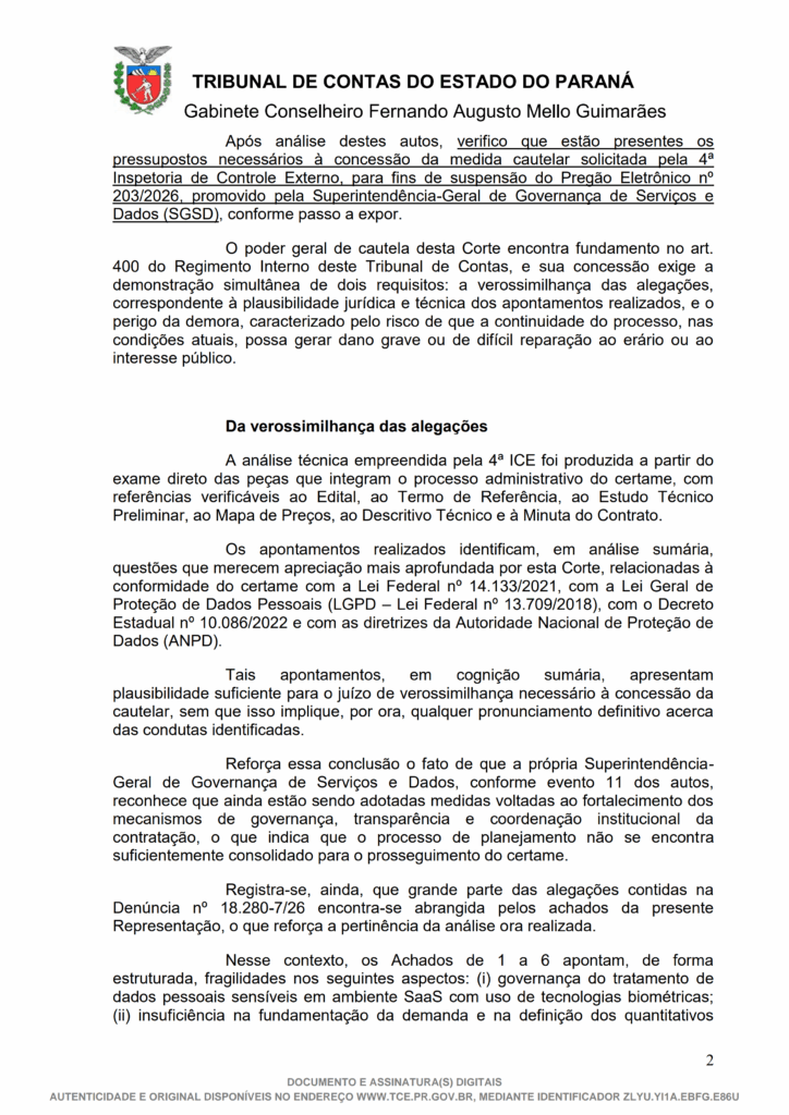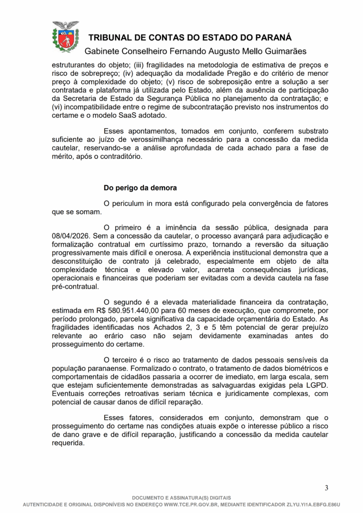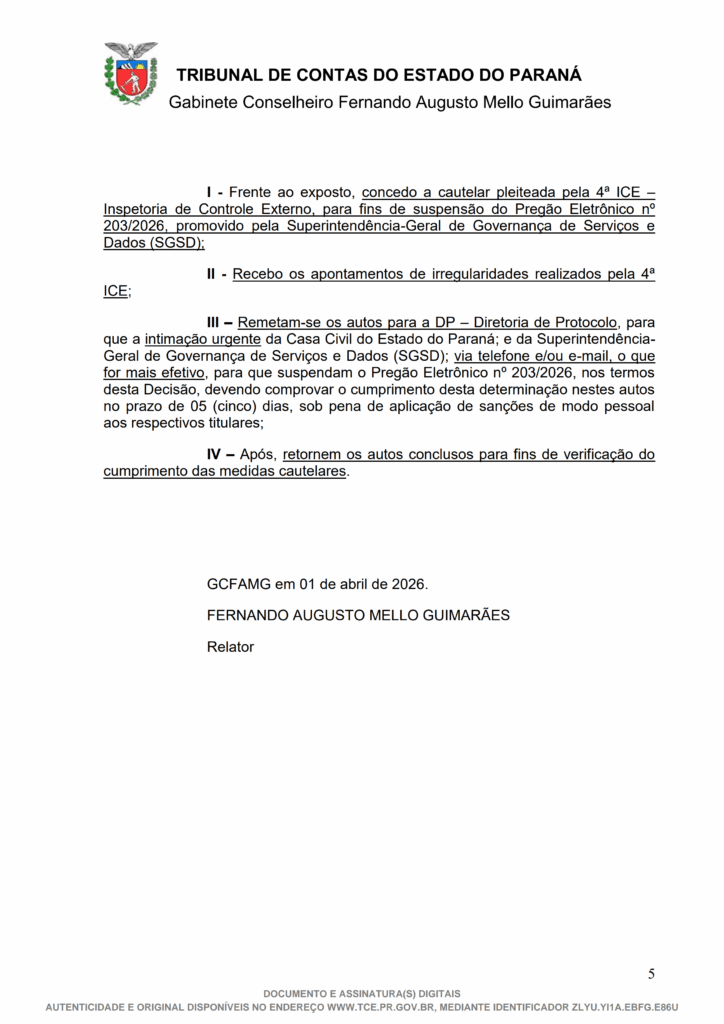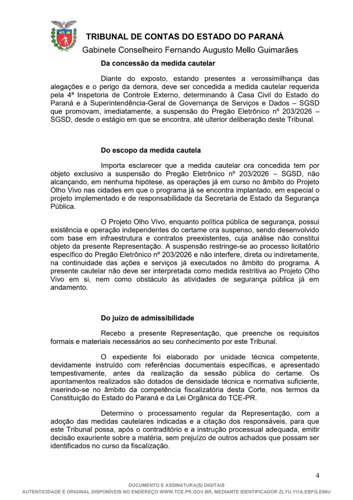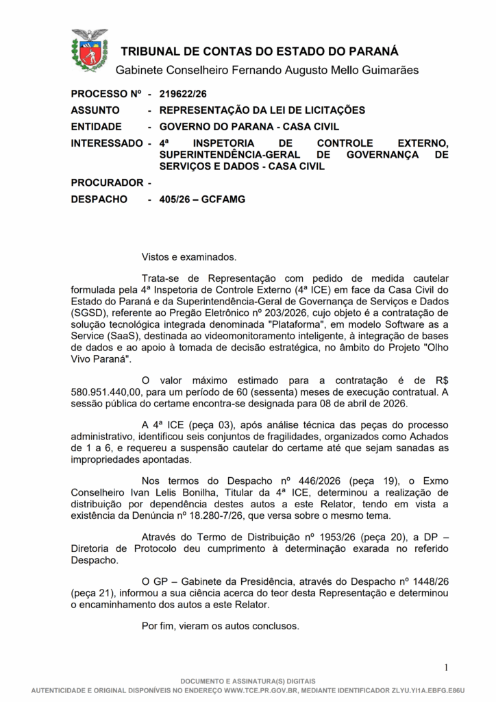 O Tribunal de Contas do Estado do Paraná (TCE-PR) suspendeu o Pregão Eletrônico nº 203/2026, que previa um investimento de R$ 580.951.440,00 para o projeto Olho Vivo Paraná. Através de uma medida cautelar, o conselheiro Fernando Augusto Mello Guimarães interrompeu o certame conduzido pela Casa Civil e pela Superintendência-Geral de Governança de Serviços e Dados (SGSD). A decisão cautelar visa evitar danos graves ao erário e proteger a privacidade dos cidadãos paranaenses.