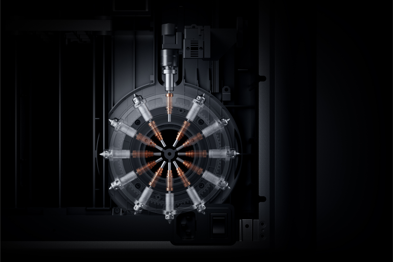 O Palette 300, vencedor do iF Design Award 2026 e do MUSE Gold Award, aborda as principais ineficiências da impressão 3D em desktop. Ao contrário dos sistemas tradicionais que dependem de "torres de purga" de alto desperdício, o Palette 300 utiliza um mecanismo de troca automática OmniElement™ de 12 bicos. Com a transição direta entre 12 bicos aquecidos independentemente, o sistema viabiliza o uso simultâneo de 12 materiais distintos e impressão em até 36 cores, reduzindo o desperdício de material e aumentando drasticamente as velocidades de comutação.